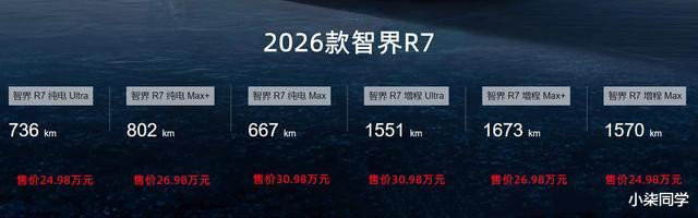 2026款智驾R7提供2种动力系统共6款配置车型,包含3款纯电版车型(纯电 Max、纯电 Max+、纯电 Ultra);3款增程版车型(增程 Max、增程 Max+、增程 Ultra),售价分别为24.98万元、26.98万元、30.98万元。